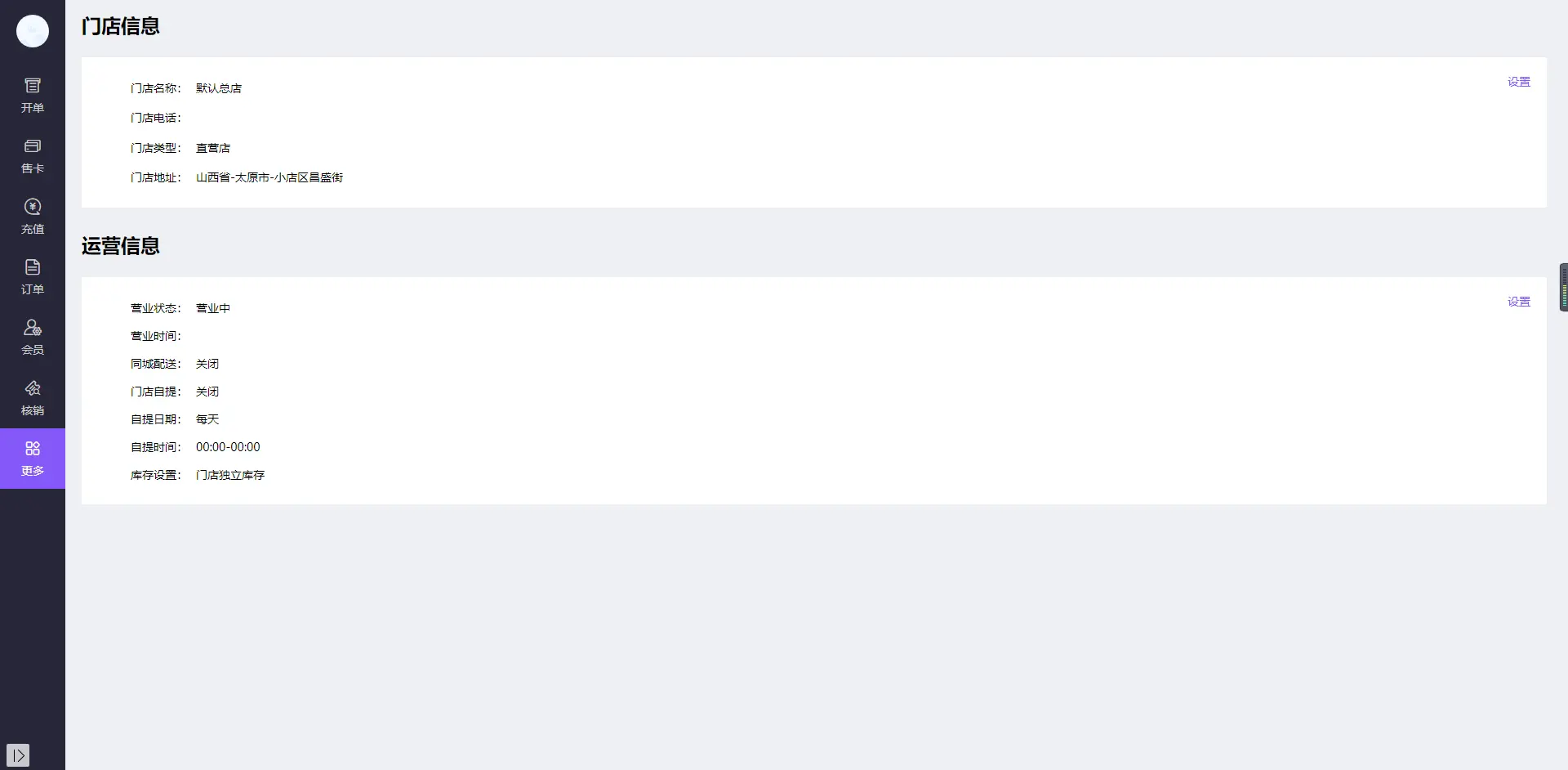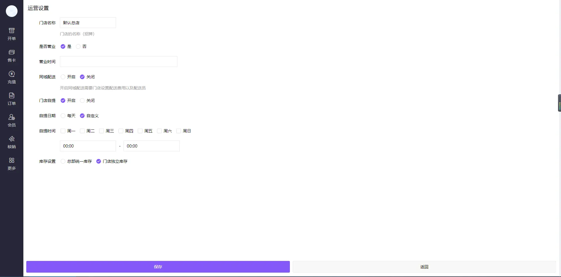 1、在门店设置可以修改门店信息 2、在运营设置里可以修改、运营状态、营业时间、同城配送开启按钮、门店自提开启按钮(开启后可以选择自提日期:每天或者自定义)